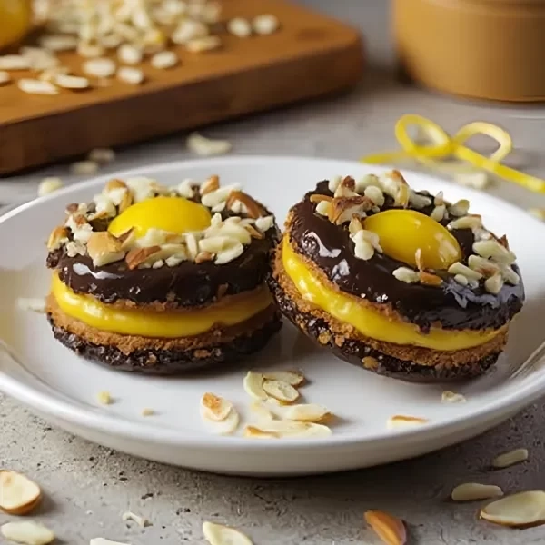 Una delicada preparación que incluye dos cookies rellenas con un suave curd de limón, bañadas en chocolate oscuro y cubiertas con almendras tostadas.